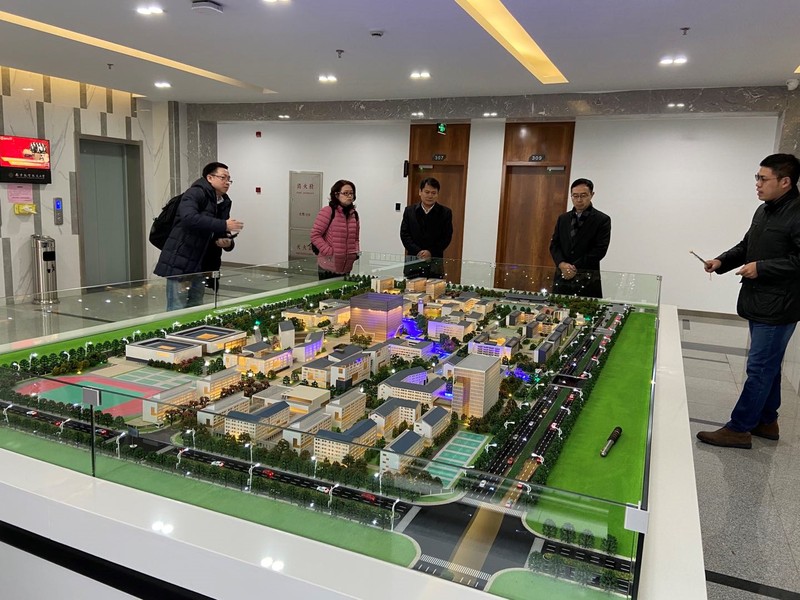 宋凌一行首先观摩了天目湖校区沙盘,校区规划与建设办公室副主任殷凯详细介绍了校区的布局和未来规划,并带领参观了教学楼、图书馆、食堂及学生公寓等区域。
