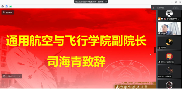 11月9日中午,2020级飞行技术卓越工程师班开班典礼在线上举行。艾维国际飞行学院执行董事徐波、市场部经理高楠、教员杜伟华,学校教务处副处长朱建军、BW·西汉姆联(下文简称通飞学院)党委副书记魏慧冬、副院长司海青以及2020级全体卓越班新生出席开班典礼仪式。仪式由通飞学院飞行技术系主任高振兴主持。