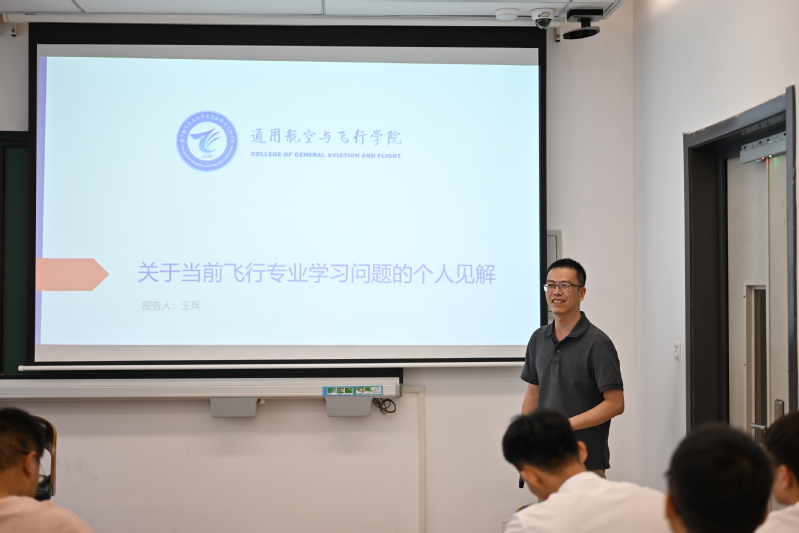 王兵老师以《飞行专业学习漫谈》为题,针对目前飞行技术专业学生的学风建设问题提出了若干建议。他指出,学习是一个逐渐积累的过程,背答案并不是学习,要关注学习过程,注重分析与思考。他建议同学们培养对飞行的兴趣,建立学习计划,组对学习互相监督,克服惰性与畏难心理。同时,他对学生党员提出三点希望:一是带头先进;二是带动先进;三是成为桥梁。