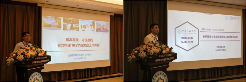 中国民航大学校团委书记、飞行分校党委副书记兼纪委书记何珠城作题为《作风建设与思想政治教育工作探索与实践》的主题汇报,介绍了中国民航大学飞行人才培养以“12345”工作治理体系,推进作风建设与思想政治教育工作。