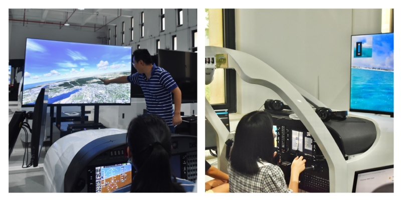参加活动的研究生在蔡老师的带领下,先后参观了飞行演示风洞实验室、飞行人因实验室、初级飞行模拟实验室和型号飞行模拟实验室。在每一个实验室,蔡老师详细介绍了各项实验仪器及设备的使用方法及应用场景。蔡老师耐心讲解之后,大家在型号飞行模拟实验室体验了塞斯纳、钻石、PA等国内外多种常用的初教机模拟机,加深了同学们对通航、对飞行的理解与认知。