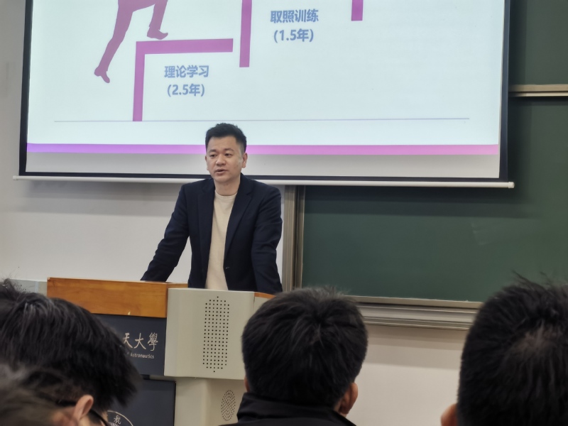 岳超介绍了吉祥航空的基本情况,讲解了飞行学员的成长路径和职业发展路径,传达了公司对飞行学员的期望。他从专业技能、英语学习、执照考试、作风建设等多方面对飞行学员提出具体要求,并勉励大家在校期间做好规划,高标准要求自己,养成良好的习惯,为后期的航校学飞打好基础。