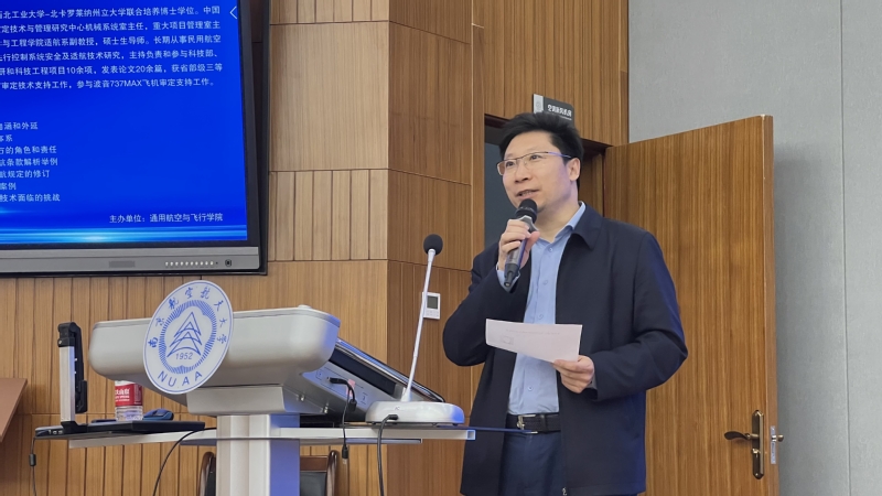 杨士斌副教授从适航的定义、内涵和外延入手,介绍了适航的法规文件体系,阐述了适航工作参与方的角色和责任,以及适航审定的基本流程和方法。他还结合运输类飞机和正常类飞机的适航条款,举例解析了适航标准的制定和实施过程,以及审定技术支持的案例。最后,他指出了安全性与适航技术面临的挑战,包括新技术、新材料、新结构等方面,展望了适航技术的发展趋势和方向。报告结束后,杨士斌副教授还与现场师生进行了互动交流。