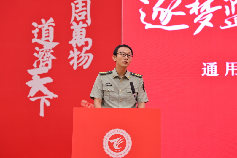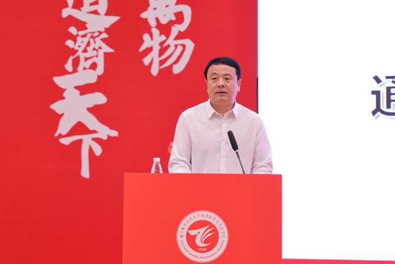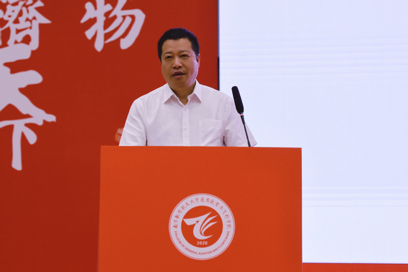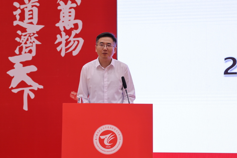 飞行技术系主任高振兴作为新生班主任代表发言。他结合自身“学在机务、教在飞行、研在民航”的经历,激励同学们走出舒适区,迎接新挑战,努力追求梦想,保持身心健康,坚持终身学习,热爱生活,热爱社会。