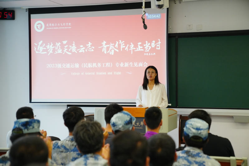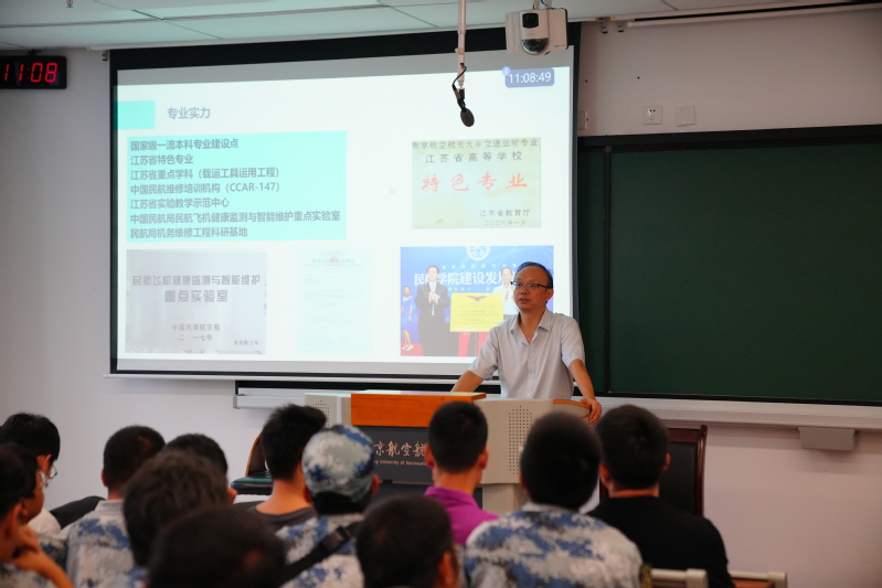 陈果详细介绍了民航机务工程专业的培养目标和未来发展,向同学们展示了本专业的实验实训平台及教学设备,并围绕培养方案为同学们提出了学习建议。他希望同学们树立专业自信,探索学习方法,在专业知识的海洋里为实现大学成就不懈奋斗。