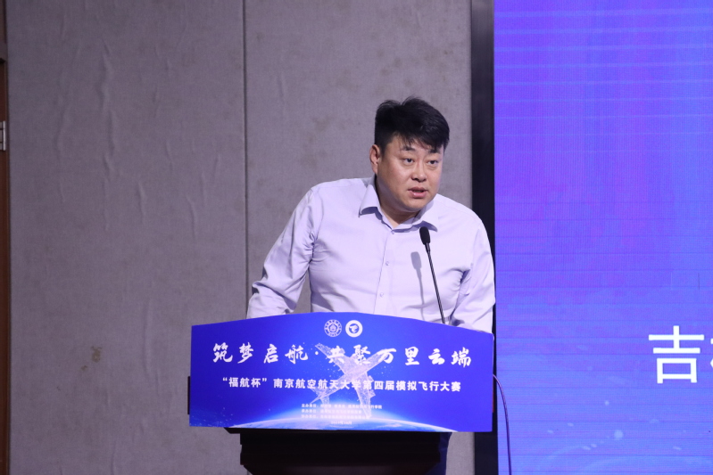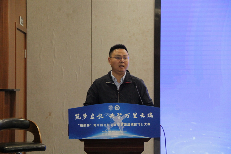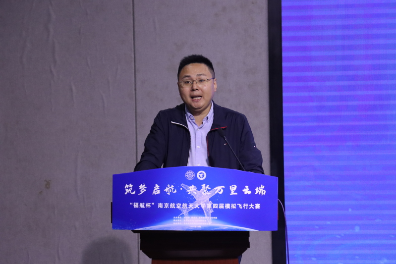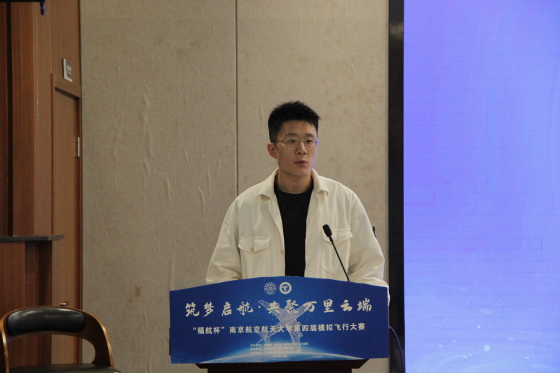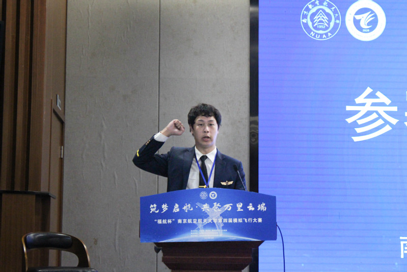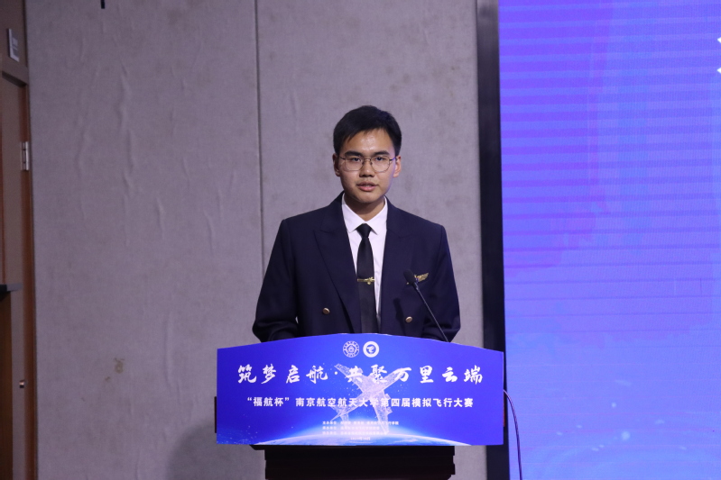 获奖学生代表周伯华发言,他通过分享自己训练备赛的心路历程,表达对模拟飞行的热爱,同时承诺将秉承团结奋进的精神,戒骄戒躁,为续写南航大模拟飞行队的荣耀继续努力。