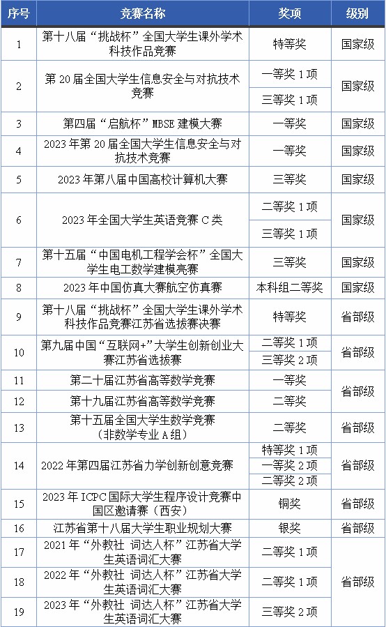 近三年来,学生在“互联网+”“挑战杯”创新类竞赛和数学、英语、信息学科类竞赛取得多项国家级和省部级成绩突破,各级各类竞赛获奖共105项,其中,学生荣获“互联网+”大学生创新创业大赛、“挑战杯”全国大学生课外学术科技作品竞赛等国家级、省部级重要竞赛奖项20余项。
