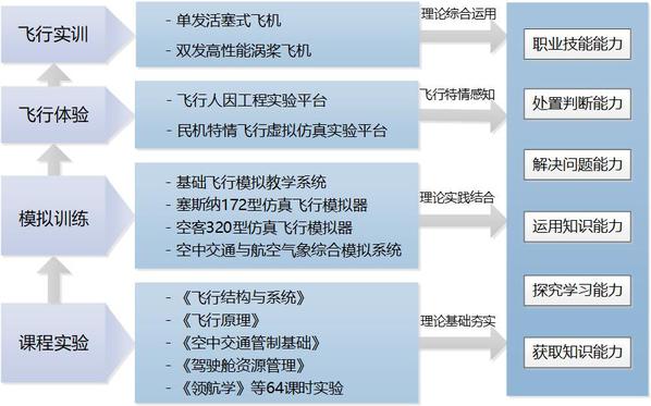 学院以建设飞行技术一流专业实训体系为目标自主建设飞行模拟系列实验室,重视教师科研成果向实践教学的转化,设计了一系列研究性、创新型教学实验项目,构建了课程实验-模拟训练-飞行体验-飞行实训四级递进的实践教学体系,开发了“基础飞行模拟教学系统”、“塞斯纳172型号仿真飞行模拟器”等实验平台。