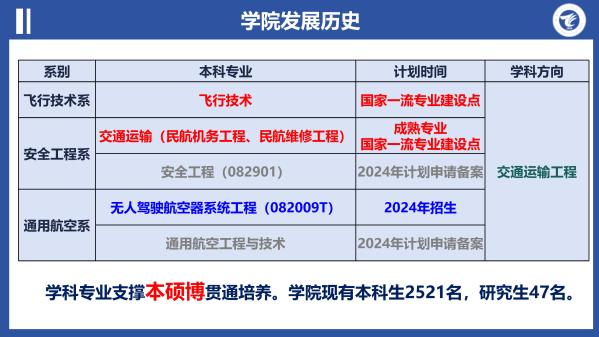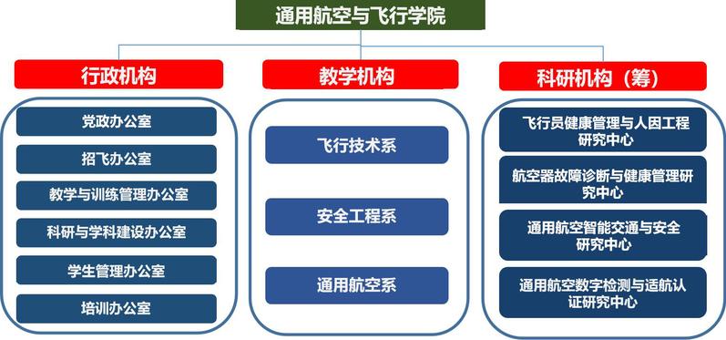 通飞学院设有飞行技术系、安全工程系和通用航空系,开设飞行技术、交通运输(民航机务工程、民航维修工程)两个专业,已获批增设无人驾驶航空器系统工程专业,计划2024年开始招生,学院的学科专业支撑本、硕、博贯通培养。未来五年,学院将围绕通航发展战略继续新增建设或增列安全工程、通用航空工程与技术等相关专业。