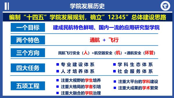 学院以编制“十四五规划”为契机,广泛调研和深入研讨,围绕“通航+飞行”两个特色,聚焦“民航飞行安全、航空器安全、通航运行安全”三个方向,确立了“学生培养、学科建设、学者引陪、学术繁荣、学院治理”五项工程实施举措,以飞行技术专业为立院之本,以人才培养为强院之基,以学术繁荣为兴院之路,强化制度建设,着力构建“专业建设、学科生态、人才培养、社会服务”四大体系,确立“建成民航特色鲜明、国内一流的应用研究型学院”目标。