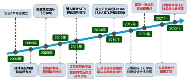 飞行技术专业办学历史可追溯到2002年正式成立飞行学院并开设的飞行技术专业,是国家“211”大学中最早设置该专业的高校。经过20余年的建设,飞行技术专业入选教育部卓越工程师计划,江苏省特色专业、国家教学综合改革试点专业和国家级一流本科专业建设点,获批江苏省品牌专业建设工程,建有江苏省实验教学与实践教育中心。持有境外驾驶员学校认可证书(联合艾维国际飞行学院)、航线运输驾驶员ATPL理论培训机构证书。学院已成为全国优秀飞行人才和民航行业人才培养的重要基地。