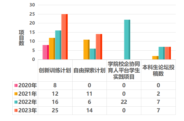 每年组织教师依托主题创新区、校企协同育人平台、课题组等发布创新训练项目和自由探索(天目启航)训练课题,学院高级职称教师均参与学生科创指导工作,学生科创项目立项数逐年递增。