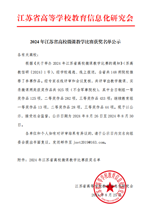 近期,2024年江苏省高等学校微课教学比赛获奖名单揭晓,BW·西汉姆联主讲教师李杰荣获省三等奖。