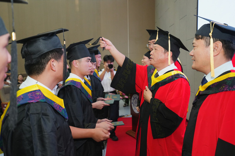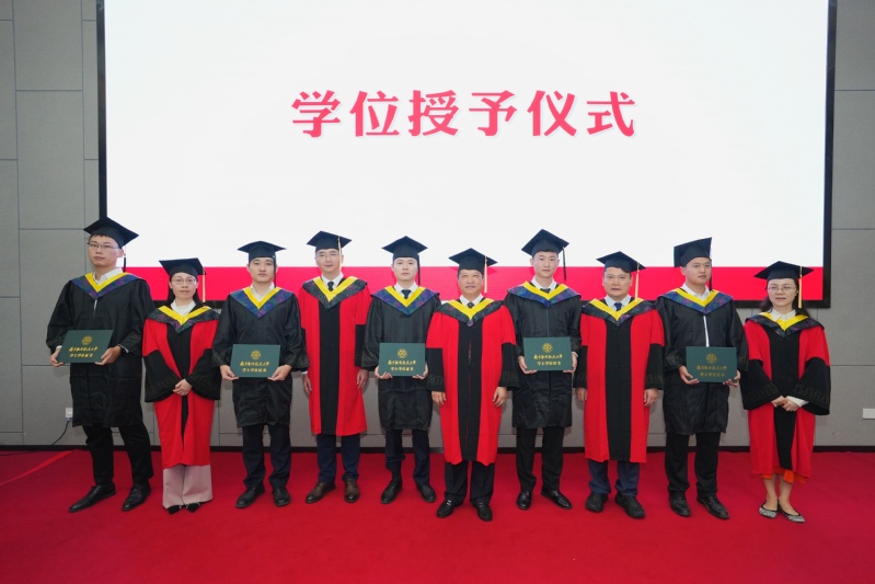 在学位授予仪式环节,王勤、司海青、高振兴、李桂芳、王叶为毕业生拨苏正冠、颁发学位证书并合影留念。