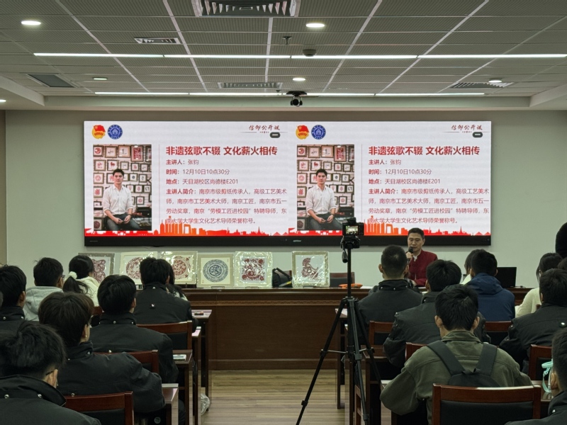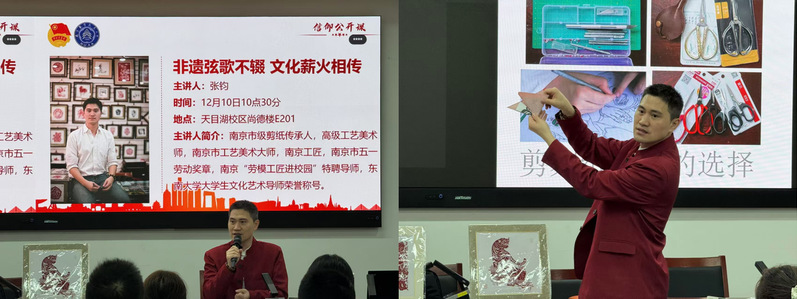 12月10日,BW·西汉姆联在天目湖校区尚德楼E201教室举办“非遗弦歌不辍 文化薪火相传”信仰公开课。此次信仰公开课邀请南京剪纸市级代表性传承人、高级工艺美术师、南京市五一劳动奖章获得者、南京“劳模工匠进校园”特聘导师、南京市剪纸学会副会长张钧主讲。100余本科生参加讲座,讲座由学院团委书记宋歌主持。