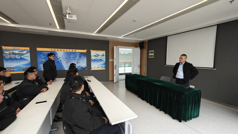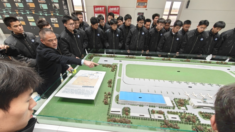 在周机长指引和介绍下,师生分组参观了机场规划沙盘、候机大厅、机库和跑道等核心区域,进一步直观地了解了航站楼的建设和功能。在停放着SKYLEADER 600、AT-3的停机坪上,机务工程师现场向同学们演示了飞机日常维护流程,大家零距离观察了飞机起落架结构、发动机舱布局等专业构造,在实地参观中巩固理论知识,切实提升专业认知。