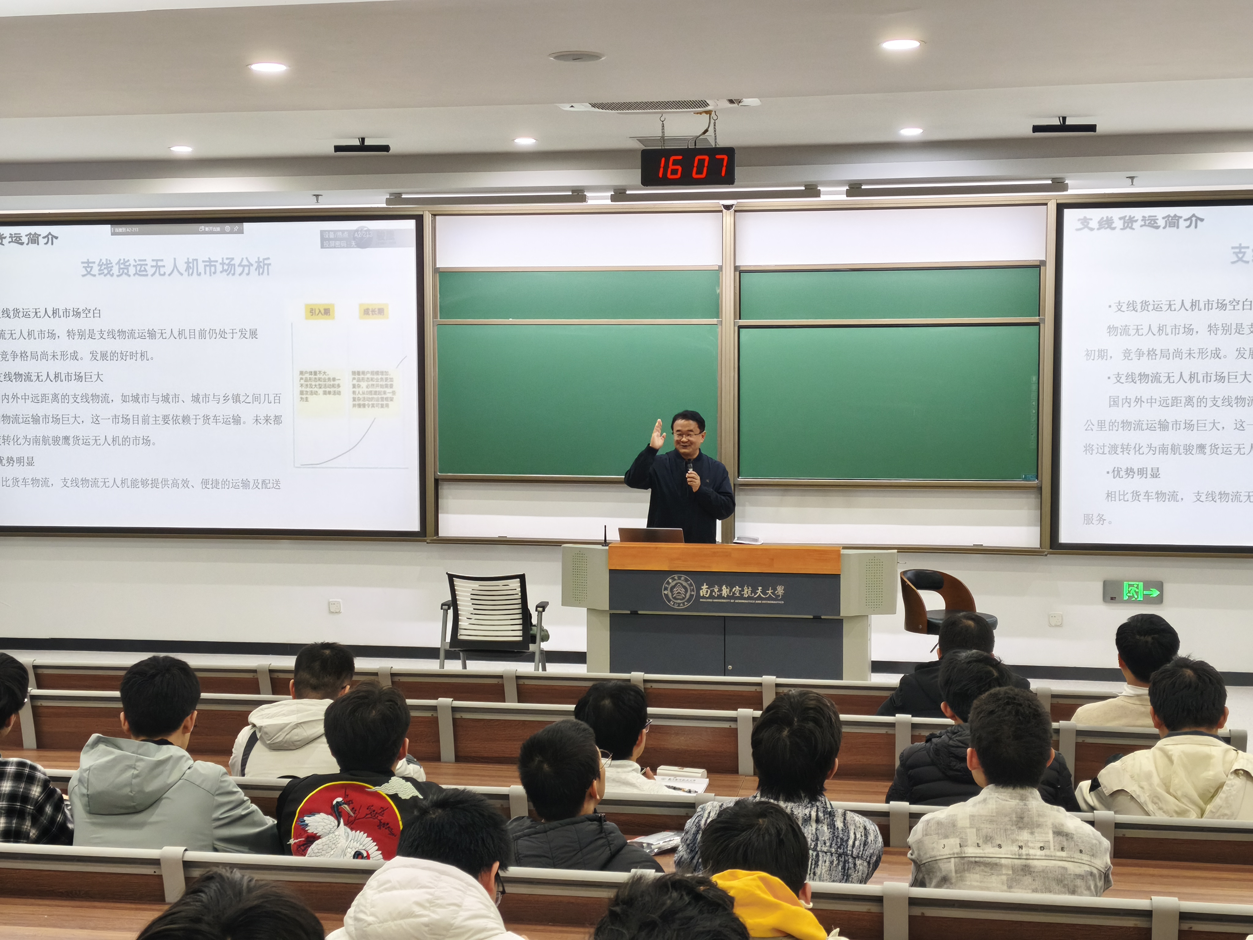 在市场应用与性能对比环节,殷健茗博士通过详实的数据图表,直观展示支线货运无人机相较于传统卡车物流在运输效率、成本控制等方面的突出优势,并结合实际订单案例与军民两用实践,阐述该领域从技术研发到产业落地的全链条逻辑。他还围绕主翼升阻比计算、机身结构优化、起落架系统设计等专业问题,与现场师生展开深入互动,耐心解答同学们在课程学习与科研实践中遇到的困惑。