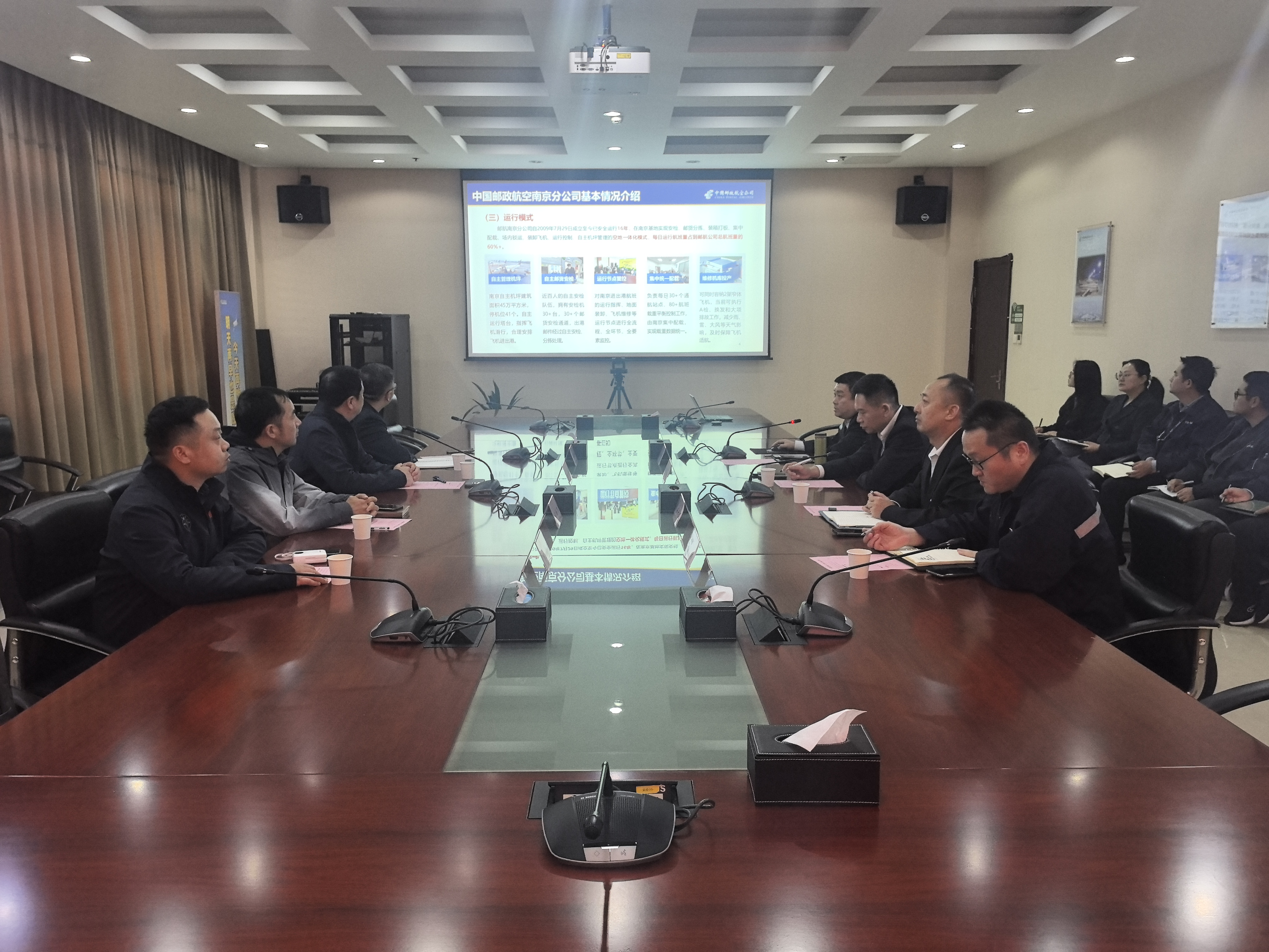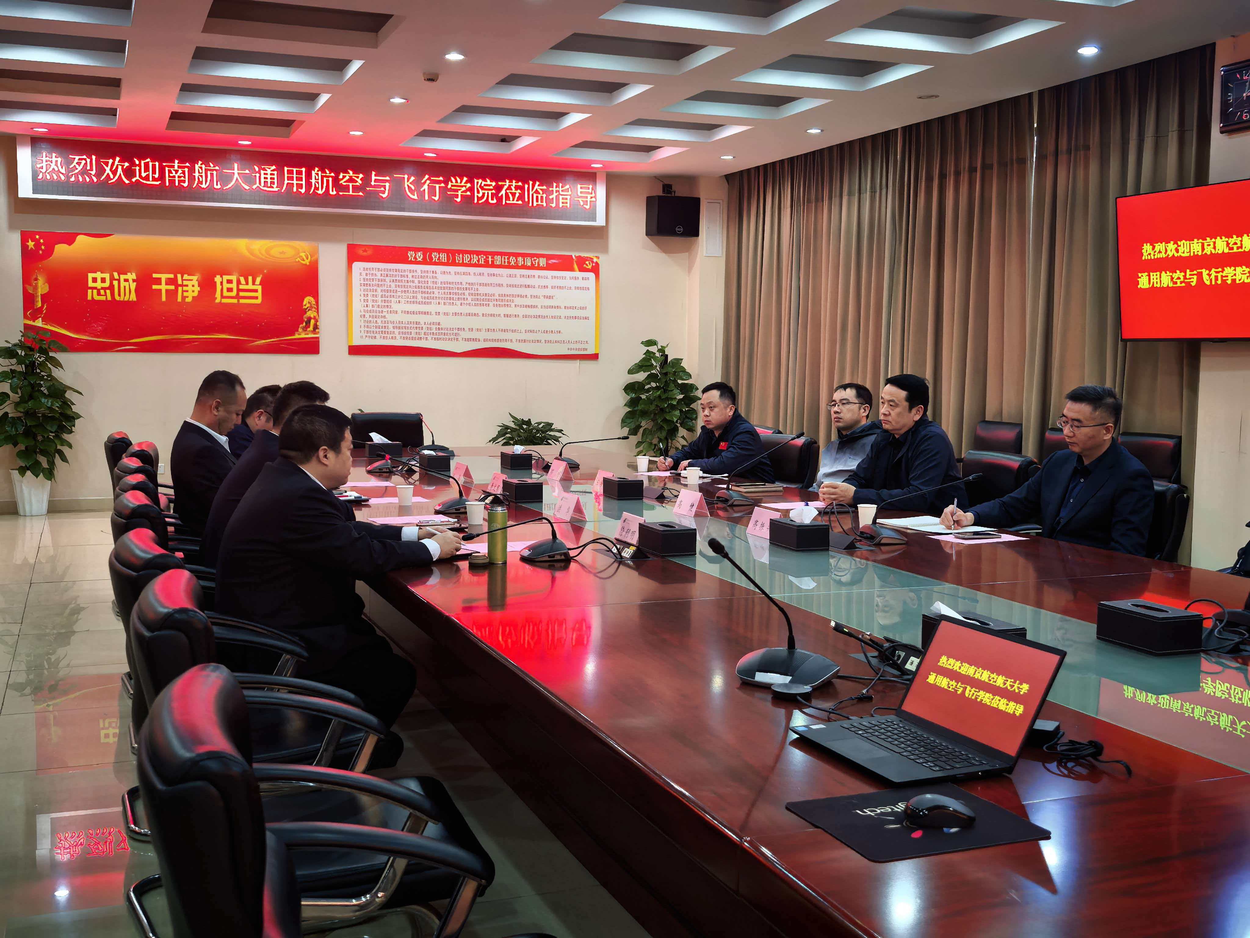 邮航南京分公司党委书记、总经理洪华携综合办公室、机务工程部管理团队及业务代表参会,通飞学院党委书记高健带队,院长助理兼飞行技术系主任高振兴、安全工程系主任王海飞、对外合作与行业培训办公室主任郁祥等相关负责人共同出席。会议由邮航南京分公司机务工程部经理李文军主持。